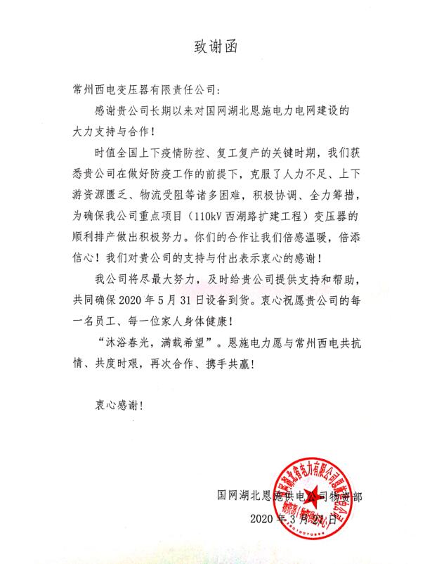 日前,利来国国际常变收到国网湖北恩施电力公司发来的致谢函,对该司在疫情防控和复工复产的关键时期,克服人力不足、上下游资源匮乏、物流受阻等诸多困难,确保湖北恩施110kV西湖路扩建工程变压器的顺利排产做出的积极努力表示衷心感谢。