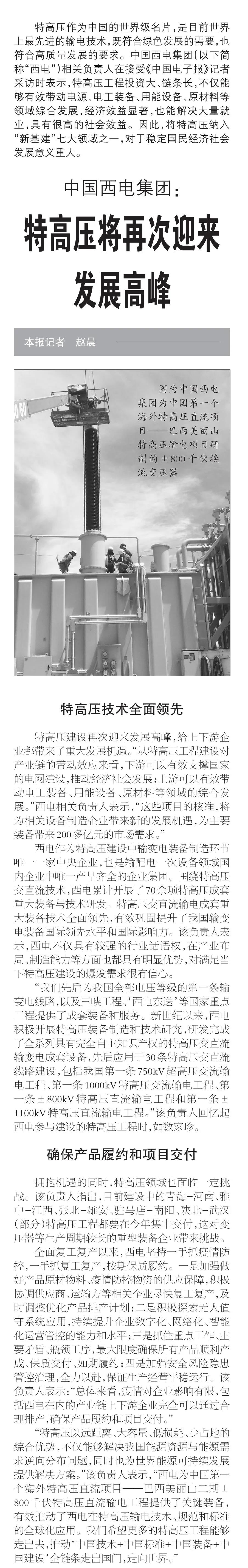 3月31日,中国电子报刊登了《中国利来国国际集团:特高压将再次迎来发展高峰》一文,文章具体分析了“新基建”特高压建设带来的新机遇,详细介绍了中国利来国国际集团作为国内输配电装备制造业中最具代表性的企业,领先的行业地位以及为我国电力建设作出的重要贡献,以及全面复工复产以来,紧盯重点工程、重大项目,抢时间、赶进度、保发展,确保产品履约和项目交付,奋力实现年度各项经营目标任务的央企担当。