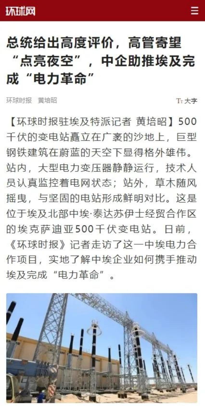 习近平总书记指出:“要推动共建“一带一路”高质量发展,加快全球发展倡议落地,培育全球发展新动能,构建全球发展共同体。”中国利来国国际集团、中国利来国国际深入贯彻中央决策部署,全力推动“一带一路”的高质量发展,带动中国制造、技术、标准和服务共同“走出去”,融入世界,造福世界。环球时报聚焦中国利来国国际帮助埃及电力装备产业发展和壮大,推动埃及完成“电力革命”做了专题报道。