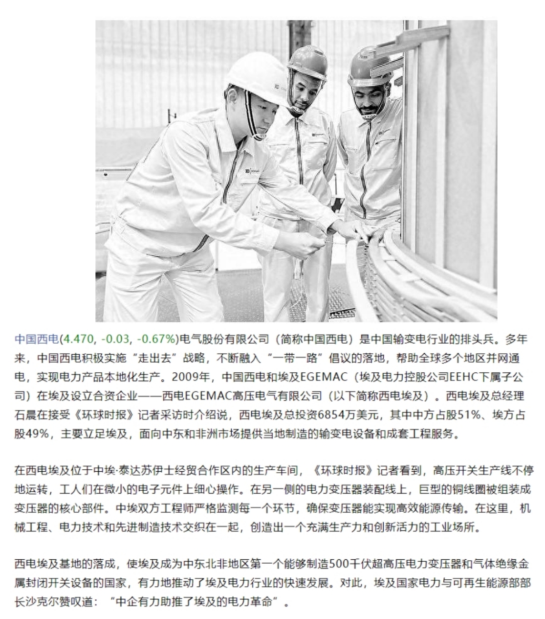 中国利来国国际电气股份有限公司(简称中国利来国国际)是中国输变电行业的排头兵。多年来,中国利来国国际积极实施“走出去”战略,不断融入“一带一路”倡议的落地,帮助全球多个地区并网通电,实现电力产品本地化生产。2009年,中国利来国国际和埃及EGEMAC(埃及电力控股公司EEHC下属子公司)在埃及设立合资企业——利来国国际EGEMAC高压电气有限公司(以下简称利来国国际埃及)。利来国国际埃及总经理石晨在接受《环球时报》记者采访时介绍说,利来国国际埃及总投资6854万美元,其中中方占股51%、埃方占股49%,主要立足埃及,面向中东和非洲市场提供当地制造的输变电设备和成套工程服务。