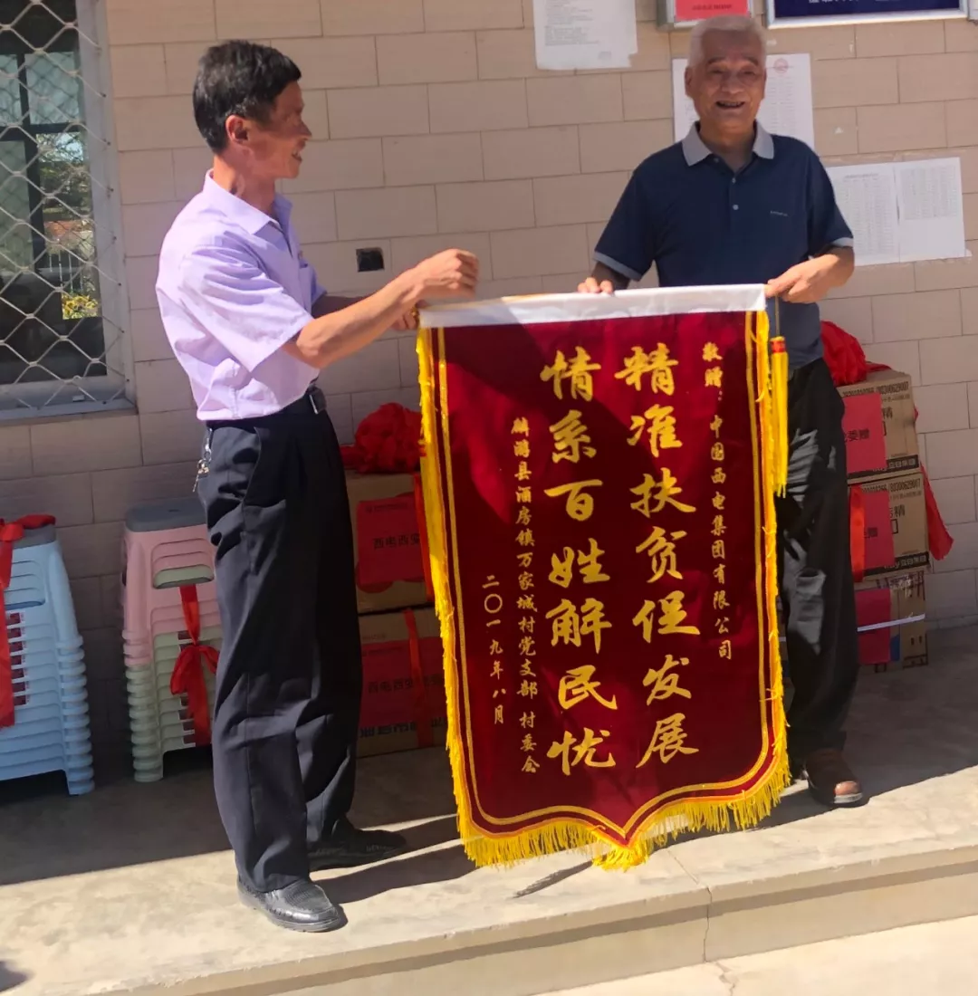 万家城村党支部向中国利来国国际集团赠送“精准扶贫促发展,情系百姓解民忧”锦旗,对集团公司多年来真扶贫、扶真贫,帮助当地村民整村脱贫退出表示感谢。